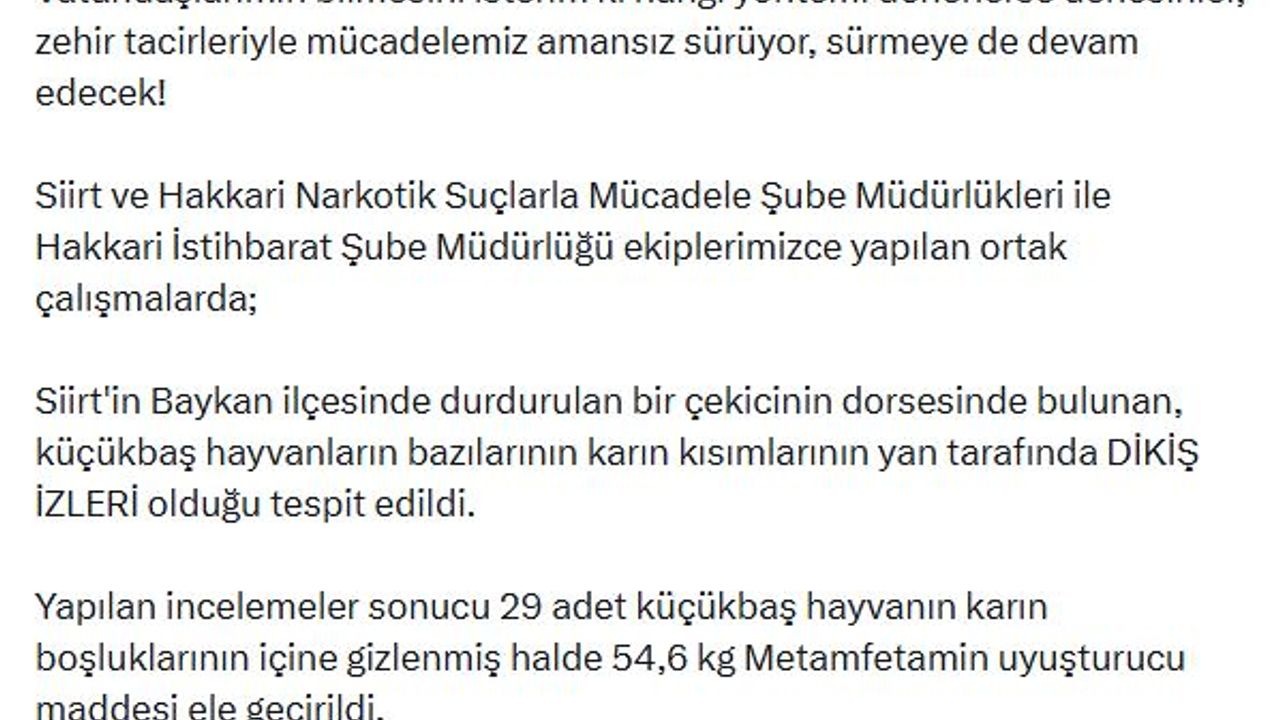 ANKARA, (DHA)- İÇİŞLERİ Bakanı Ali Yerlikaya, Siirt'te 29 küçükbaşların karın boşluğuna gizlenmiş halde 54,6 kilogram metamfetamin ele geçirildiğini, 2 şüphelinin gözaltına alındığını açıkladı.