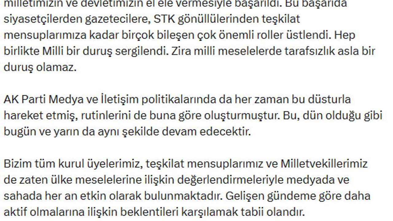 AK Parti'li Acar, sanal medya hesabından yaptığı açıklamada, 'Türkiye son çeyrek asırda ulusal ve uluslararası birçok badire atlattı. Çok ciddi reformlara imza attı. Bunlar, Cumhurbaşkanımızın liderliğinde milletimizin ve devletimizin el ele vermesiyle başarıldı. Bu başarıda siyasetçilerden gazetecilere, STK gönüllülerinden teşkilat mensuplarımıza kadar birçok bileşen çok önemli roller üstlendi. Hep birlikte milli bir duruş sergilendi. Zira milli meselelerde tarafsızlık asla bir duruş olamaz. AK Parti medya ve iletişim politikalarında da her zaman bu düsturla hareket etmiş, rutinlerini de buna göre oluşturmuştur. Bu, dün olduğu gibi bugün ve yarın da aynı şekilde devam edecektir. Bizim tüm kurul üyelerimiz, teşkilat mensuplarımız ve milletvekillerimiz de zaten ülke meselelerine ilişkin değerlendirmeleriyle medyada ve sahada her an etkin olarak bulunmaktadır. Gelişen gündeme göre daha aktif olmalarına ilişkin beklentileri karşılamak tabii olandır. Bunun dışında ortaya atılan ve partimize atfedilen gündemlerin gerçeği yansıtmadığını kamuoyunun bilgisine sunarız' ifadelerini kullandı. (DHA)