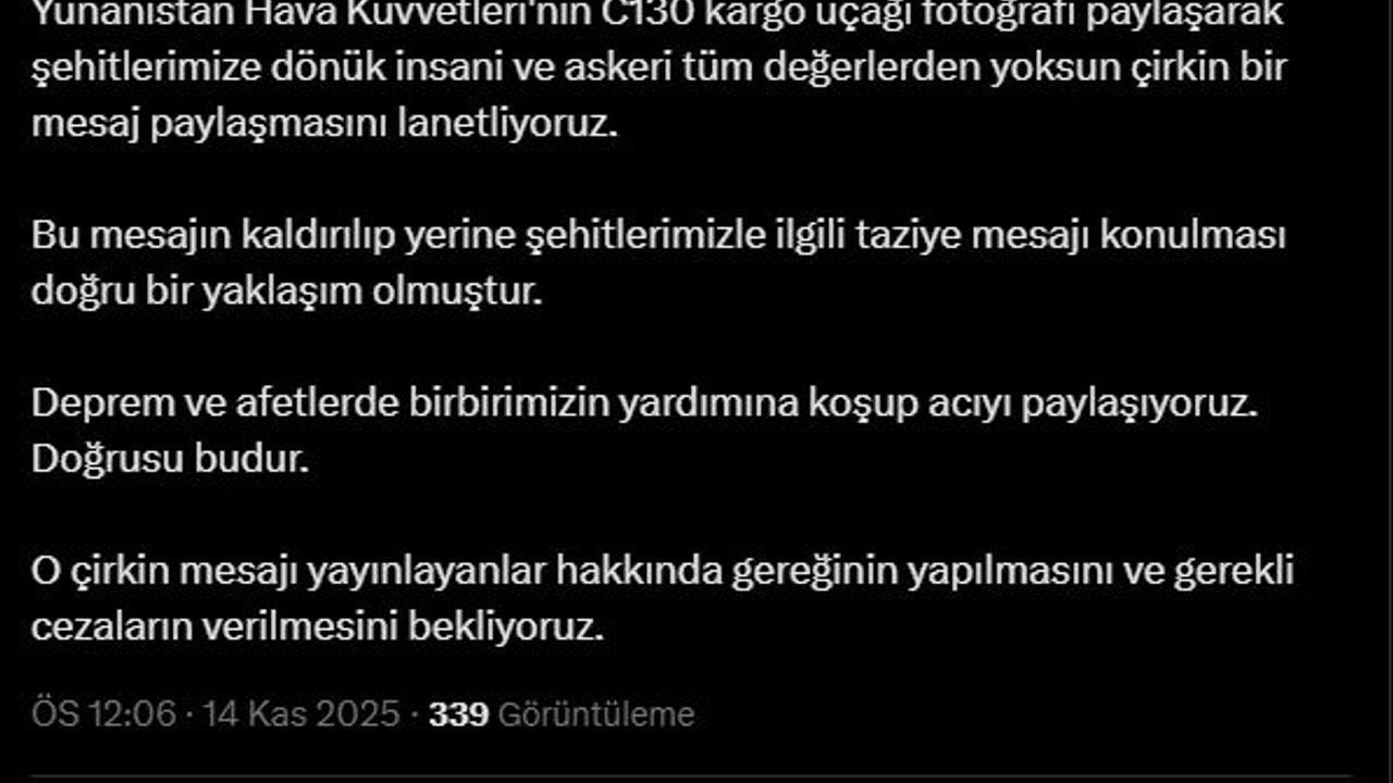 AK Parti Sözcüsü Ömer Çelik, sosyal medya hesabından yaptığı paylaşımda, "Yunanistan Hava Kuvvetleri'nin C130 kargo uçağı fotoğrafı paylaşarak şehitlerimize dönük insani ve askeri tüm değerlerden yoksun çirkin bir mesaj paylaşmasını lanetliyoruz. Bu mesajın kaldırılıp yerine şehitlerimizle ilgili taziye mesajı konulması doğru bir yaklaşım olmuştur. Deprem ve afetlerde birbirimizin yardımına koşup acıyı paylaşıyoruz. Doğrusu budur. O çirkin mesajı yayınlayanlar hakkında gereğinin yapılmasını ve gerekli cezaların verilmesini bekliyoruz" ifadelerini kullandı. (DHA)