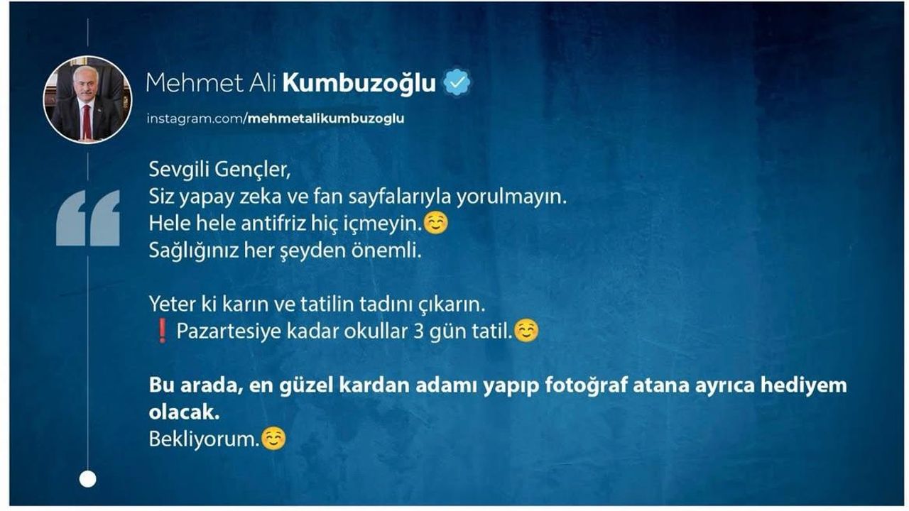 Aksaray Valisi Mehmet Ali Kumbuzoğlu, sanal medya hesabından yaptığı açıklamada, kent genelinde yoğun kar yağışı ve buzlanma nedeniyle okulların tatil edildiğini duyurdu Vali Kumbuzoğlu, 'Sevgili gençler siz yapay zeka ve fan sayfalarıyla yorulmayın. Hele hele antifriz hiç içmeyin. Sağlığınız her şeyden önemli. Yeter ki yarın karın tadını çıkarın. Pazartesi gününü kadar okullar 3 gün tatil. Bu arada en güzel kardan adamı yapıp fotoğraf atana ayrıca hediyem olacak,' dedi.