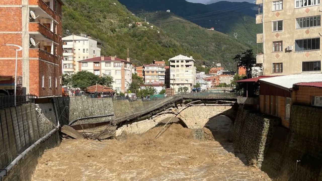 Artvin'in Borçka ilçesinden geçen Aksu Deresi üzerinde yer alan asırlık tarihi köprü de sel sularına dayanamayarak yıkıldı. İlçe merkezinde araç ve yaya geçişini sağlayan, uzun yıllardır kültürel anlamda da önem taşıyan ve bir süre önce restore edilen köprünün yıkılmadan önce ve sonraki hali kameraya yansıdı. (DHA)