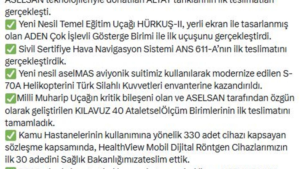 Akyol paylaşımında, ASELSAN için 2025 yılının önemli gelişmelerini sıraladı. (DHA)