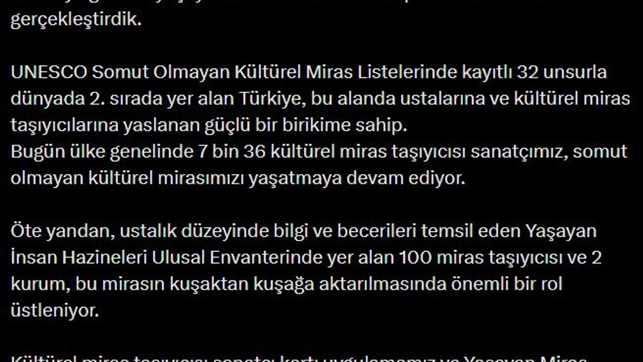 Kültür ve Turizm Bakanı Mehmet Nuri Ersoy, sanal medya hesabından yaptığı paylaşımda, 'Somut olmayan kültürel miras taşıyıcısı ebru sanatçımız Duygu Orak ile bir araya gelerek yaşayan mirasımız üzerine kapsamlı bir sohbet gerçekleştirdik. UNESCO Somut Olmayan Kültürel Miras Listelerinde kayıtlı 32 unsurla dünyada 2'nci sırada yer alan Türkiye, bu alanda ustalarına ve kültürel miras taşıyıcılarına yaslanan güçlü bir birikime sahip. Bugün ülke genelinde 7 bin 36 kültürel miras taşıyıcısı sanatçımız, somut olmayan kültürel mirasımızı yaşatmaya devam ediyor. Öte yandan, ustalık düzeyinde bilgi ve becerileri temsil eden Yaşayan İnsan Hazineleri Ulusal Envanterinde yer alan 100 miras taşıyıcısı ve 2 kurum, bu mirasın kuşaktan kuşağa aktarılmasında önemli bir rol üstleniyor. Kültürel miras taşıyıcısı sanatçı kartı uygulamamız ve Yaşayan Miras Okulu ile geleneksel sanat ve zanaatlarımızı genç kuşaklarla buluşturuyor, yaşayan mirasımızı güçlü adımlarla geleceğe taşıyoruz' dedi. (DHA)