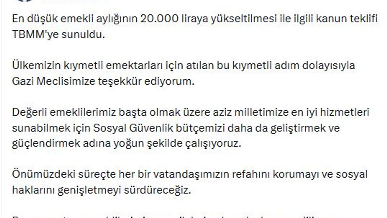 Bakan Işıkhan, sanal medya hesabından yaptığı açıklamada, 'En düşük emekli aylığının 20 bin TL'ye yükseltilmesi ile ilgili kanun teklifi TBMM'ye sunuldu. Ülkemizin kıymetli emektarları için atılan bu kıymetli adım dolayısıyla Gazi Meclisimize teşekkür ediyorum. Değerli emeklilerimiz başta olmak üzere aziz milletimize en iyi hizmetleri sunabilmek için Sosyal Güvenlik bütçemizi daha da geliştirmek ve güçlendirmek adına yoğun şekilde çalışıyoruz. Önümüzdeki süreçte her bir vatandaşımızın refahını korumayı ve sosyal haklarını genişletmeyi sürdüreceğiz. Başımızın tacı emeklilerimize ve ailelerine hayırlı olmasını diliyorum' dedi. (DHA)