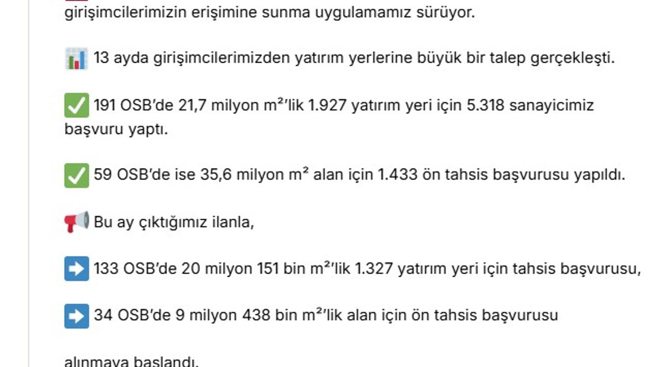 ANKARA, (DHA)- SANAYİ ve Teknoloji Bakanı Mehmet Fatih Kacır, organize sanayi bölgesi (OSB) parsellerinin çevrim içi ortamda yatırımcılara tahsisi uygulaması kapsamında, 5 bin 318 sanayicinin 191 OSB’deki 21,7 milyon metrekarelik 1927 yatırım yeri için başvuru yaptığını duyurdu.