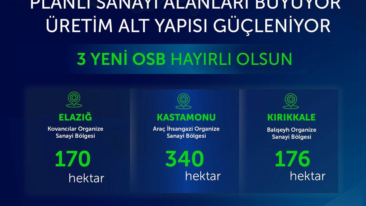 Bakan Kacır, sanal medya hesabından yapılan açıklamada, 'Ülkemizin planlı sanayi alanlarını büyütmeye, üretim altyapısını güçlendirmeye devam ediyoruz. 3 yeni organize sanayi bölgemiz şehirlerimize, milletimize hayırlı olsun; Elazığ Kovancılar OSB, Kastamonu Araç İhsangazi OSB, Kırıkkale Balışeyh OSB. 2002 yılında 191 olan OSB sayımız bugün 373'e ulaştı. 2 milyon 700 bin emekçimiz OSB'lerde çalışıyor. Sanayide yeni hamlelerle ülkemizin dört bir yanını yatırımlarla buluşturmayı sürdüreceğiz' ifadelerini kullandı. (DHA)