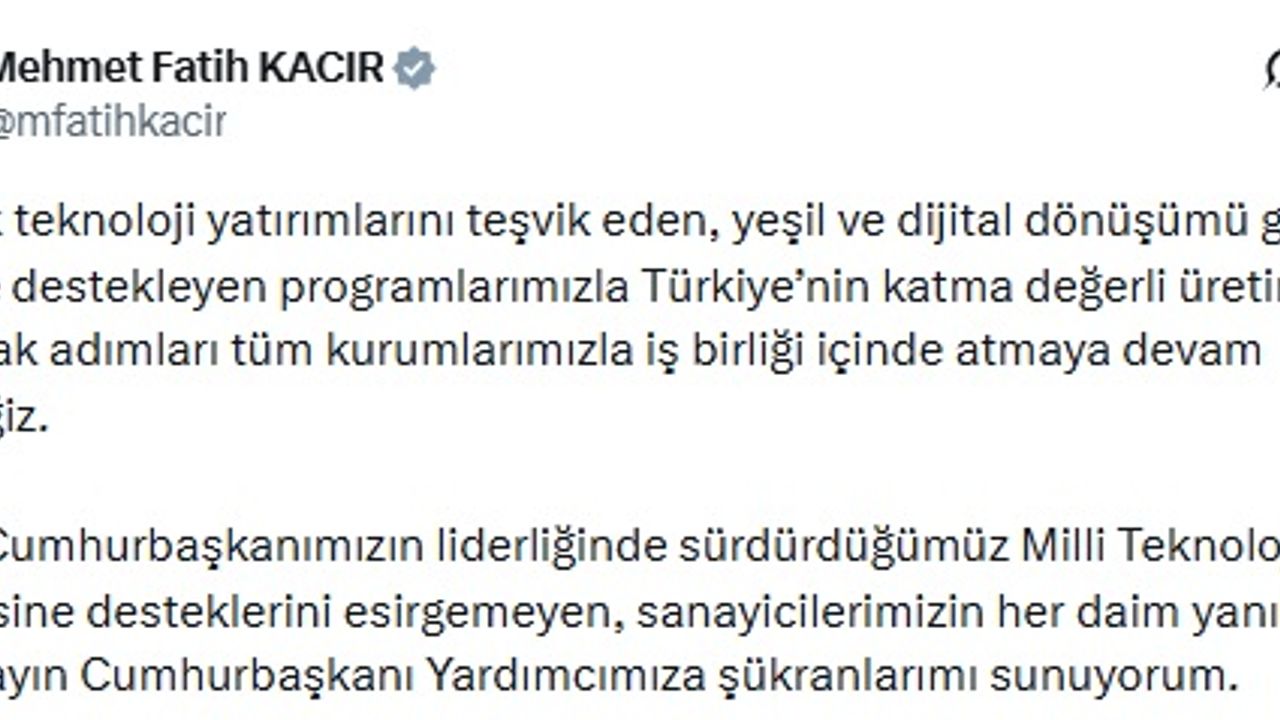 Bakan Kacır, sanal medya hesabından yaptığı paylaşımda, 'Yüksek teknoloji yatırımlarını teşvik eden, yeşil ve dijital dönüşümü güçlü şekilde destekleyen programlarımızla Türkiye'nin katma değerli üretimini artıracak adımları tüm kurumlarımızla iş birliği içinde atmaya devam edeceğiz. Sayın Cumhurbaşkanımızın liderliğinde sürdürdüğümüz Milli Teknoloji Hamlesine desteklerini esirgemeyen, sanayicilerimizin her daim yanında olan Sayın Cumhurbaşkanı Yardımcımıza şükranlarımı sunuyorum' ifadelerini kullandı. (DHA)