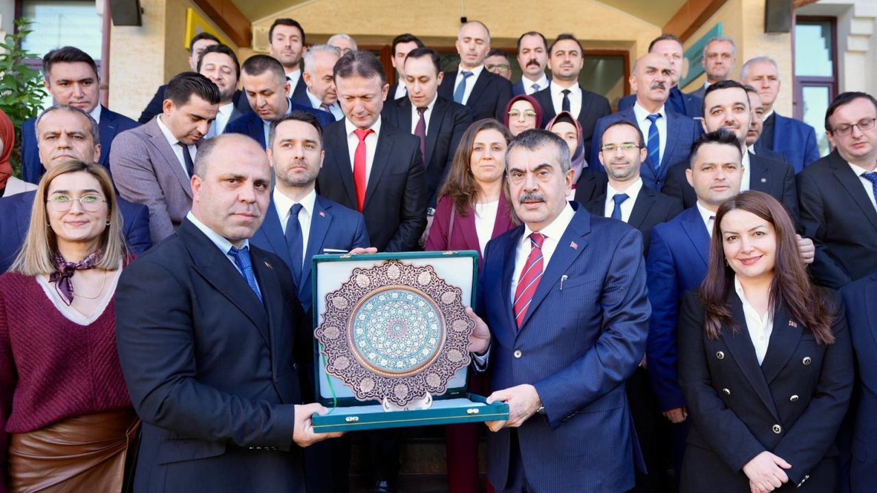 Tekin, programın sonunda öğretmenlerle okul binası önünde hatıra fotoğrafı çektirdi. Öğretmenler, Bakan Tekin'e ceviz ağacından, el yapımı, işlemeli bir plaket hediye etti.