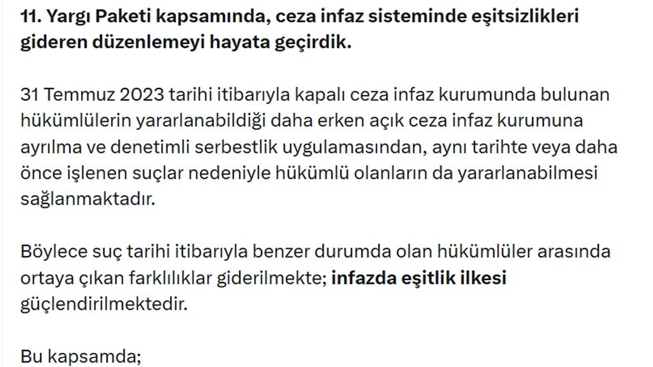 Adalet Bakanı Yılmaz Tunç, sanal medya hesabından yaptığı açıklamada, '11'inci Yargı Paketi kapsamında, ceza infaz sisteminde eşitsizlikleri gideren düzenlemeyi hayata geçirdik. 31 Temmuz 2023 tarihi itibarıyla kapalı ceza infaz kurumunda bulunan hükümlülerin yararlanabildiği daha erken açık ceza infaz kurumuna ayrılma ve denetimli serbestlik uygulamasından, aynı tarihte veya daha önce işlenen suçlar nedeniyle hükümlü olanların da yararlanabilmesi sağlanmaktadır. Böylece suç tarihi itibarıyla benzer durumda olan hükümlüler arasında ortaya çıkan farklılıklar giderilmekte; infazda eşitlik ilkesi güçlendirilmektedir. Bu kapsamda; 31 Temmuz 2023 tarihi ve öncesinde işlenen suçlar bakımından; 3 yıl daha erken açık ceza infaz kurumuna ayrılabilme, 3 yıl daha erken denetimli serbestliğe ayrılabilme imkanı tanınmaktadır' ifadelerini kullandı.
