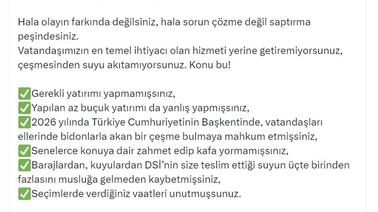 Bakan Yumaklı, CHP Genel Başkanı Özgür Özel'in Denizli mitinginde kullandığı, 'Tayyip Bey, 'Yağmur yağmasın, Ankara susuz kalsın' diye dua ediyor' ifadeleri ve Devlet Su İşleri (DSİ) Genel Müdürlüğü'ne yönelik eleştirilerine tepki gösterdi. Yumaklı, sanal medya hesabından yaptığı açıklamada, 'Sayın Özgür Özel; Mansur Yavaş'ın yaptığı veya yaptırdığı bir baraj yoktur. DSİ'nin yapıp teslim ettiği suyu, vatandaşımızın çeşmesinden akıtmayı beceremeyen bir Ankara Büyükşehir Belediyesi vardır. Hala olayın farkında değilsiniz, hala sorun çözme değil saptırma peşindesiniz. Vatandaşımızın en temel ihtiyacı olan hizmeti yerine getiremiyorsunuz, çeşmesinden suyu akıtamıyorsunuz. Konu bu! Gerekli yatırımı yapmamışsınız, yapılan az buçuk yatırımı da yanlış yapmışsınız. 2026 yılında Türkiye Cumhuriyetinin Başkentinde, vatandaşları ellerinde bidonlarla akan bir çeşme bulmaya mahkum etmişsiniz, senelerce konuya dair zahmet edip kafa yormamışsınız. Barajlardan, kuyulardan DSİ'nin size teslim ettiği suyun üçte birinden fazlasını musluğa gelmeden kaybetmişsiniz, seçimlerde verdiğiniz vaatleri unutmuşsunuz' dedi.