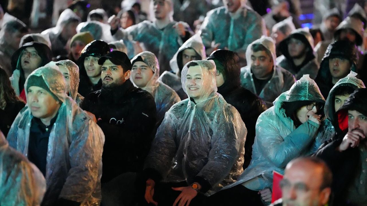 Türkiye A Milli Futbol Takımı 2026 FIFA Dünya Kupası Avrupa Elemeleri play-off turu final maçında Kosova'yı deplasmanda 1-0 mağlup etti. Ay yıldızlı takım aldığı galibiyetle 24 yıl sonra Dünya Kupası'na katılmaya hak kazandı. Vatandaşlar, milli maçı Kent Meydanı'nda kurulan dev ekrandan yağmur altında izledi. Milli takımın maçı kazanarak Dünya Kupası'na katılması vatandaşlar tarafından sevinçle karşılandı. (DHA)