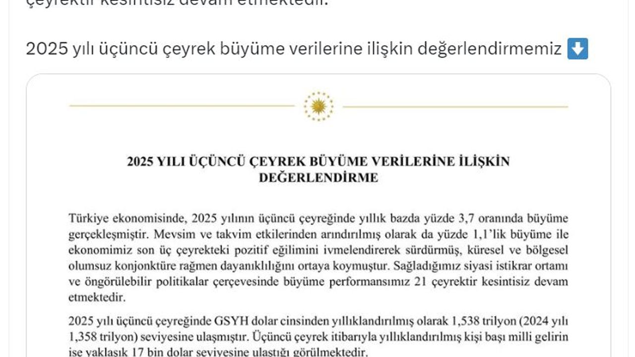 ANKARA, (DHA)- CUMHURBAŞKANI Yardımcısı Cevdet Yılmaz, 2025 yılı üçüncü çeyrek büyüme verilerine ilişkin, "Üçüncü çeyrek verileri, dengeli büyüme modelimize uygun olarak ekonomimizin dirençli yapısını ve sürdürülebilir büyüme patikasındaki kararlılığımızı ortaya koymaktadır" dedi.