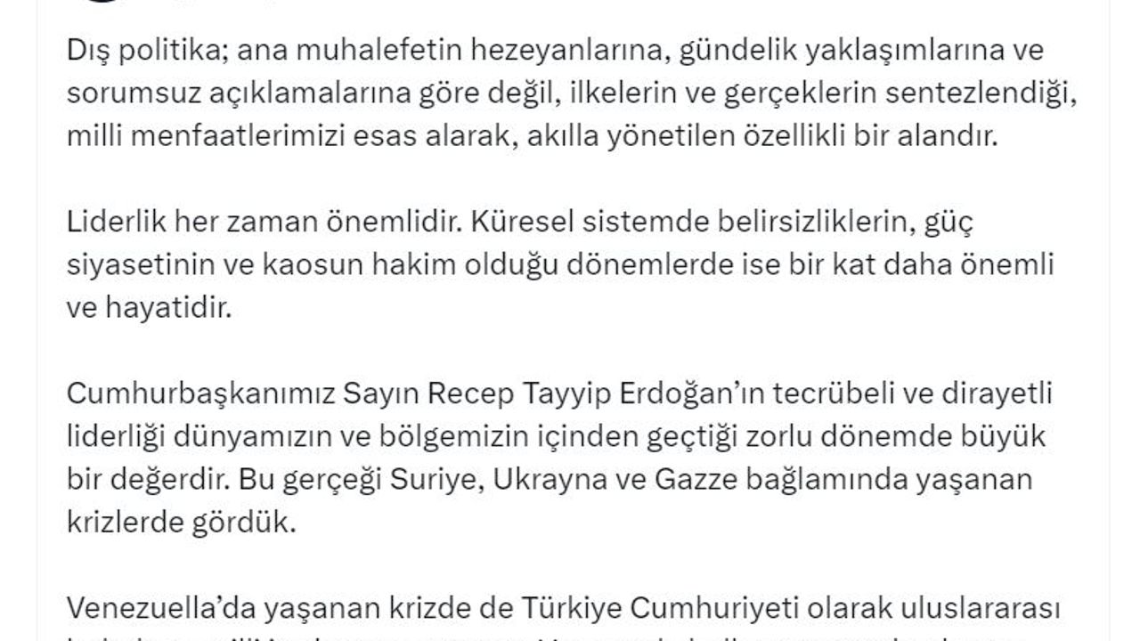 Cevdet Yılmaz, sanal medya hesabından yaptığı açıklamada, 'Dış politika; ana muhalefetin hezeyanlarına, gündelik yaklaşımlarına ve sorumsuz açıklamalarına göre değil, ilkelerin ve gerçeklerin sentezlendiği, milli menfaatlerimizi esas alarak, akılla yönetilen özellikli bir alandır. Liderlik her zaman önemlidir. Küresel sistemde belirsizliklerin, güç siyasetinin ve kaosun hakim olduğu dönemlerde ise bir kat daha önemli ve hayatidir. Cumhurbaşkanımız Sayın Recep Tayyip Erdoğan'ın tecrübeli ve dirayetli liderliği dünyamızın ve bölgemizin içinden geçtiği zorlu dönemde büyük bir değerdir. Bu gerçeği Suriye, Ukrayna ve Gazze bağlamında yaşanan krizlerde gördük. Venezuella'da yaşanan krizde de Türkiye Cumhuriyeti olarak uluslararası hukukun, milli iradeye saygının ve Venezuela halkının yanında olmaya; tüm taraflarla diyalog içinde istikrarı savunmaya devam edeceğiz' ifadelerini kullandı. (DHA)