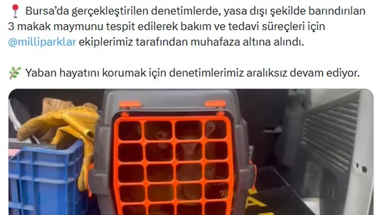 ANKARA, (DHA)- TARIM ve Orman Bakanlığı, Bursa'da ele geçirilen 3 makak maymununun koruma altına alındığını açıkladı.