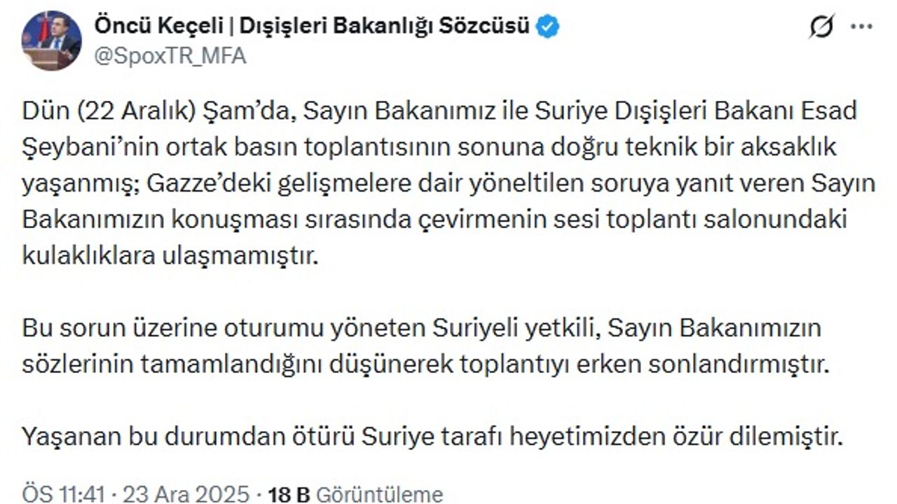 Dışişleri Bakanlığı Sözcüsü Öncü Keçeli, sosyal medya hesabından yaptığı açıklamada, '22 Aralık'ta Şam'da, Sayın Bakanımız ile Suriye Dışişleri Bakanı Esad Şeybani'nin ortak basın toplantısının sonuna doğru teknik bir aksaklık yaşanmış, Gazze'deki gelişmelere dair yöneltilen soruya yanıt veren Sayın Bakanımızın konuşması sırasında çevirmenin sesi toplantı salonundaki kulaklıklara ulaşmamıştır. Bu sorun üzerine oturumu yöneten Suriyeli yetkili, Sayın Bakanımızın sözlerinin tamamlandığını düşünerek toplantıyı erken sonlandırmıştır. Yaşanan bu durumdan ötürü Suriye tarafı heyetimizden özür dilemiştir' ifadelerini kullandı. (DHA)