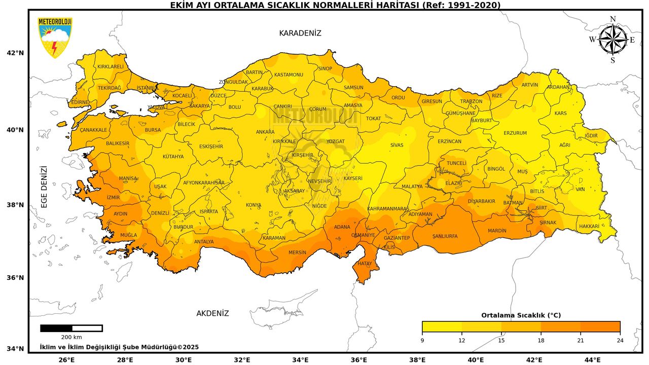 Meteoroloji Genel Müdürlüğü, 2025 yılı Ekim ayı sıcaklık analizi raporunu yayımladı. Buna göre, 2025 yılı Ekim ayında ortalama sıcaklıklar, Dalaman, Acıpayam, Korkuteli, Akhisar, Muğla, Kızılcahamam çevrelerinde mevsim normallerinin altında; Kale (Demre), Van, Başkale ve Şırnak çevrelerinde mevsim normallerinin üzerinde; bölgenin diğer kesimlerinde mevsim normalleri civarında gerçekleşti. 1991-2020 normalleri ekim ayı ortalama sıcaklığı 15.6 derece olup 2025 yılı Ekim ayı sıcaklığı ise 15.7 derece ile normallerinin 0.1 derece üzerinde gerçekleşti. 2025 yılı Ekim ayında en düşük sıcaklık sıfırın altında 6.8 derece ile Sivas Kangal’da, en yüksek sıcaklık ise 37.5 derece ile Şırnak Cizre’de ölçüldü. Öte yandan, 2025 Ekim ayında yeni ekstrem sıcaklık (maksimum, minimum) gerçekleşmediği belirtildi. (DHA)