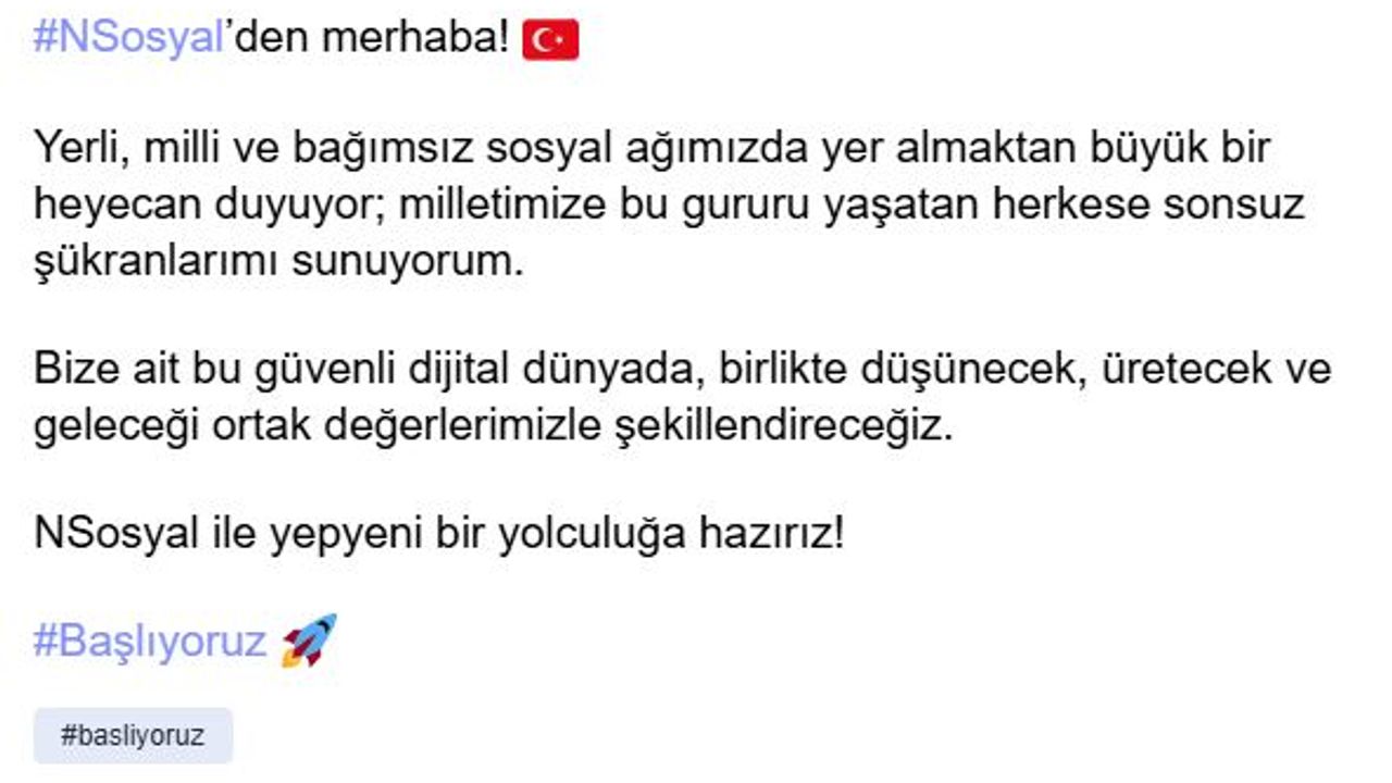 Cumhurbaşkanı Recep Tayyip Erdoğan'ın eşi Emine Erdoğan yerli sosyal medya platformu NSosyal'deki ilk paylaşımında, "NSosyal'den merhaba. Yerli, milli ve bağımsız sosyal ağımızda yer almaktan büyük bir heyecan duyuyor; milletimize bu gururu yaşatan herkese sonsuz şükranlarımı sunuyorum. Bize ait bu güvenli dijital dünyada, birlikte düşünecek, üretecek ve geleceği ortak değerlerimizle şekillendireceğiz. NSosyal ile yepyeni bir yolculuğa hazırız" ifadelerini kullandı. (DHA)