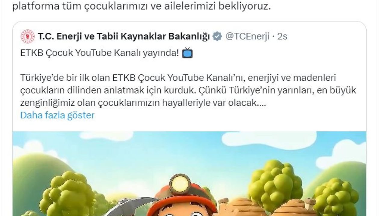 Bakanlığın sosyal medya hesabından yapılan açıklamada, 'Türkiye'de bir ilk olan ETKB Çocuk YouTube Kanalı'nı, enerjiyi ve madenleri çocukların dilinden anlatmak için kurduk. Çünkü Türkiye'nin yarınları, en büyük zenginliğimiz olan çocuklarımızın hayalleriyle var olacak. Bu kanalla rüzgarın gücünden güneşe, madenlerimizin gizemli dünyasından yerli kaynaklarımıza kadar Türkiye'nin enerji serüvenini çizgi filmlerle, eğlenceli hikayelerle ekranlara taşıyoruz. Eskişehir Beylikova'daki nadir toprak elementlerinin keşif yolculuğu için hazırladığımız özel çizgi film serisi de şimdi ETKB Çocuk YouTube Kanalı'nda yayında. Enerjiyi öğrenmek hiç bu kadar keyifli olmamıştı. Haydi çocuklar, keşfetmeye hazır mısınız? İzleyin, öğrenin, hayal edin' denildi.