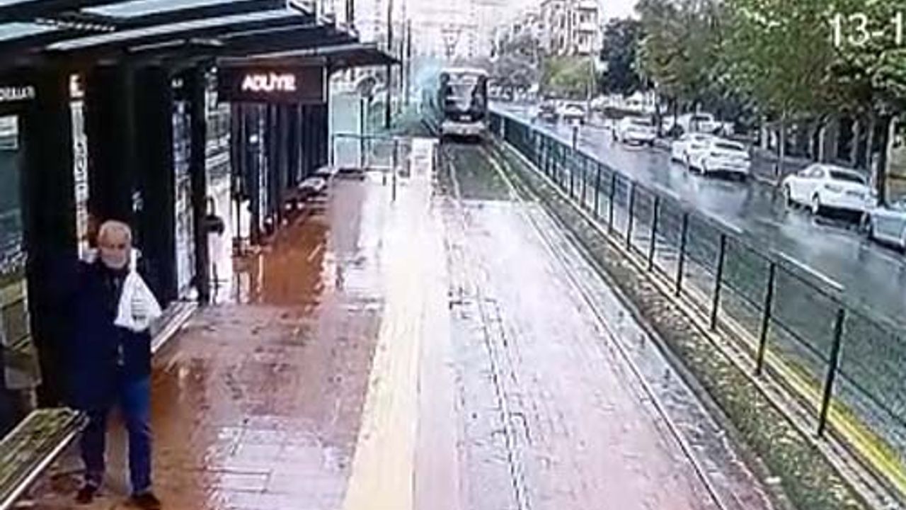 Gaziantep’te seyir halindeki tramvaya yıldırım düştüğü anlara ilişkin güvenlik kamerası görüntüleri ortaya çıktı. Görüntülerde tramvayın duraktan yolcu aldıktan sonra hareket ettiği, bir süre sonra da dumanlar yükseldiği görüldü.