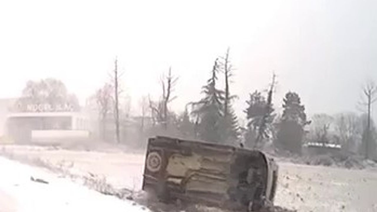 Musa KESKİN/ DÜZCE, (DHA)- DÜZCE'de kar nedeniyle kayganlaşa yolda, hafif ticari aracın kontrolden çıkarak yol kenarına devrildiği anlar, arkasından gelen otomobilin kamerasına yansıdı.