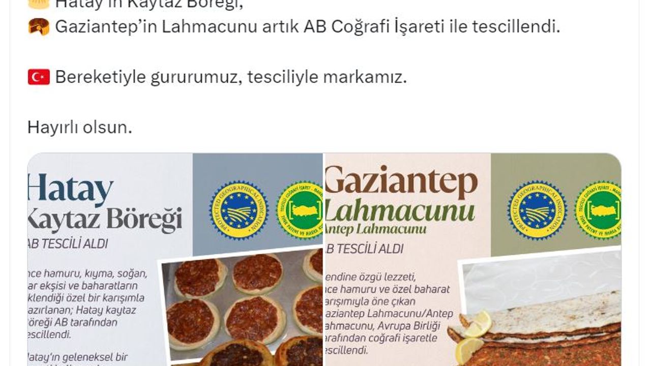 Yumaklı'nın paylaşımındaki bilgiye göre Hatay kaytaz böreği AB tescili alan 39'uncu, Gaziantep lahmacunu ise 40'ıncı Türk ürünü oldu. (DHA)