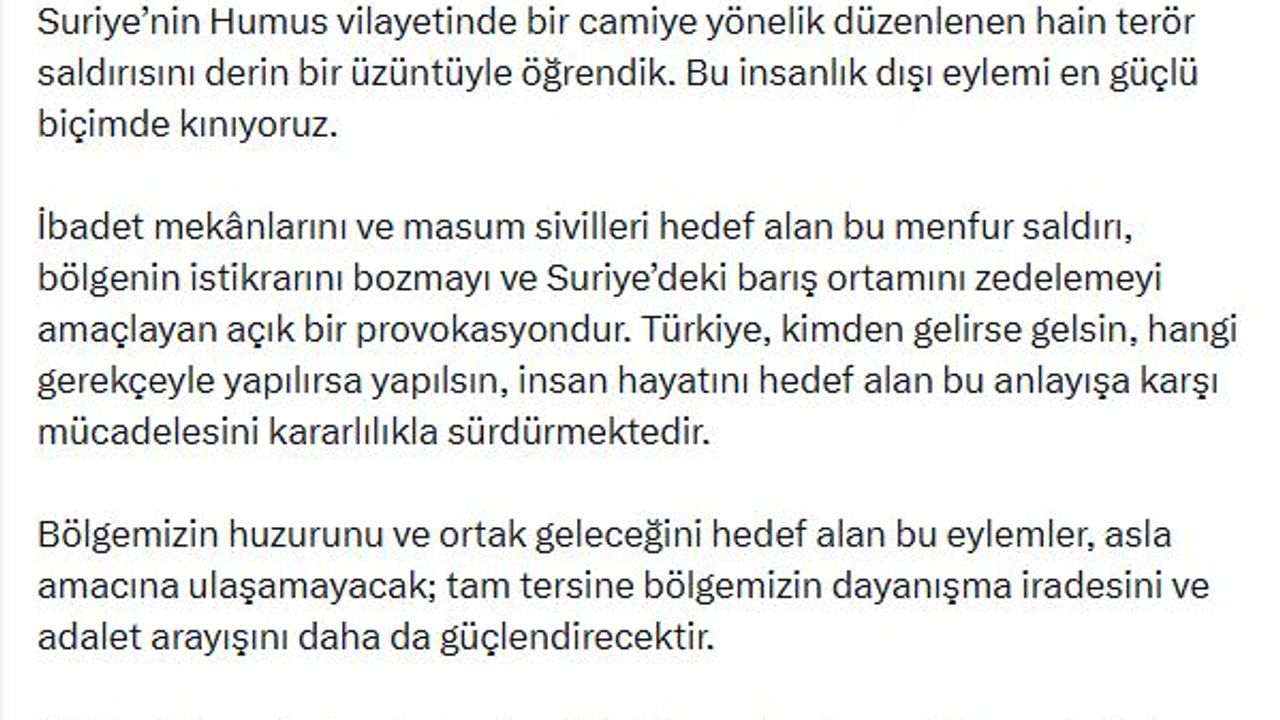 İletişim Başkanı Burhanettin Duran, sanal medya hesabından yaptığı açıklamada, 'Suriye'nin Humus vilayetinde bir camiye yönelik düzenlenen hain terör saldırısını derin bir üzüntüyle öğrendik. Bu insanlık dışı eylemi en güçlü biçimde kınıyoruz. İbadet mekanlarını ve masum sivilleri hedef alan bu menfur saldırı, bölgenin istikrarını bozmayı ve Suriye'deki barış ortamını zedelemeyi amaçlayan açık bir provokasyondur. Türkiye, kimden gelirse gelsin, hangi gerekçeyle yapılırsa yapılsın, insan hayatını hedef alan bu anlayışa karşı mücadelesini kararlılıkla sürdürmektedir. Bölgemizin huzurunu ve ortak geleceğini hedef alan bu eylemler, asla amacına ulaşamayacak; tam tersine bölgemizin dayanışma iradesini ve adalet arayışını daha da güçlendirecektir. Saldırıda hayatını kaybedenlere Allah'tan rahmet, yaralılara acil şifalar diliyor; dost ve kardeş Suriye halkına başsağlığı dileklerimizi iletiyoruz' dedi. (DHA)
