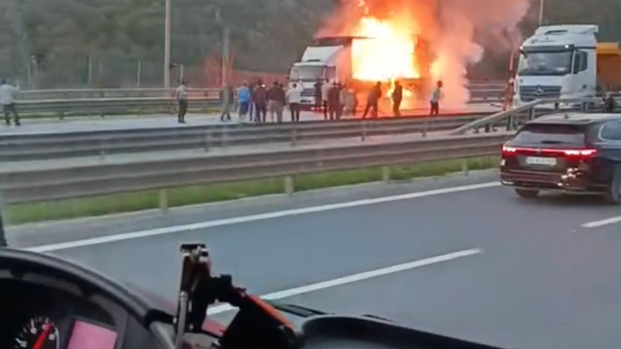 Yangın, saat 17.15 sıralarında Kuzey Marmara Otoyolu Ankara istikametinde çıktı. Otoyolda seyreden kamyonun kasasında bilinmeyen bir nedenle çıkan yangın kısa sürede büyüdü. Çevredekilerin ihbarı üzerine adrese itfaiye, acil sağlık ve polis ekipleri geldi. Alevler itfaiye ekipleri tarafından söndürüldü. Sağlık ekiplerinin kontrollerinde yangında yaralanan kimsenin olmadığı belirlendi. Kamyonun alev alev yandığı anlar çevredeki kişiler tarafından cep telefonu ile kaydedildi. (DHA)