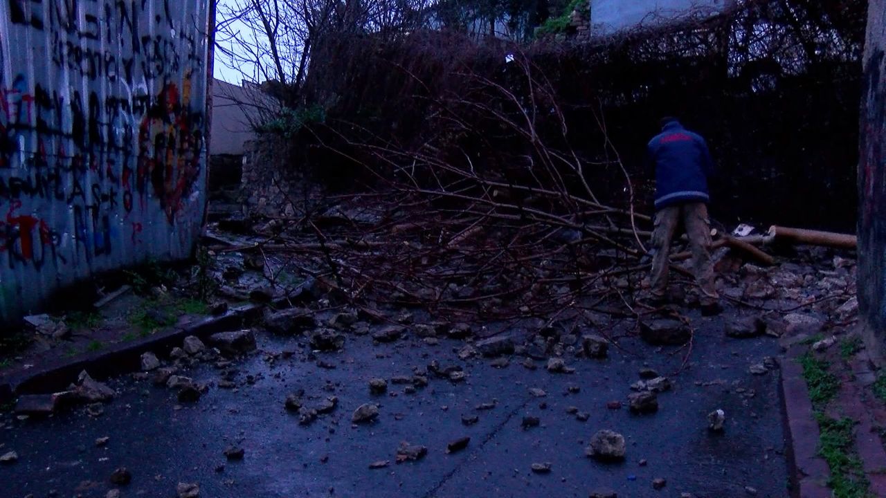 Baran AKKAYA-Utku Can SÖNMEZ/İSTANBUL,(DHA)-İSTANBUL genelinde etkili olan yağış nedeniyle Fatih'te istinat duvarı çöktü. Olayın ardından trafiğe kapatılan sokakta ekipler yola dökülen parçaları kaldırmak için çalışma başlattı.