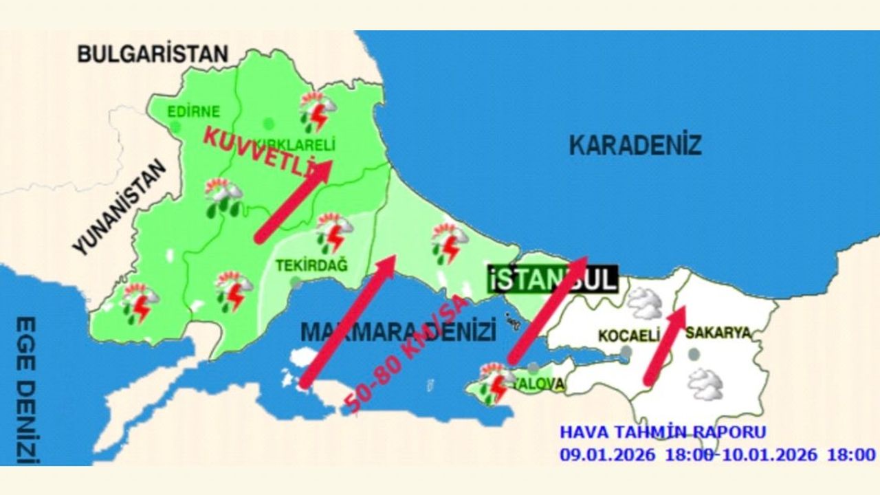 İstanbul genelinde yarından itibaren beklenen yağış ve şiddetli rüzgara ilişkin uyarıda bulunan İstanbul Valiliği, 'Meteoroloji Genel Müdürlüğü'nün yaptığı son değerlendirmelere göre; İstanbul'da yarın (10.01.2026 Cumartesi) havanın parçalı ve çok bulutlu, öğle saatlerinden sonra aralıklı sağanak yağışlı geçeceği tahmin ediliyor. Sıcaklıkların hissedilir derecede artarak mevsim normallerinin üzerinde seyredeceği tahmin ediliyor. Rüzgârın öğle saatlerinden itibaren il genelinde güney ve güneybatı (Lodos) yönlerden kuvvetli (40-60 km/saat), zaman zaman fırtına (50-75 km/saat), yer yer kuvvetli fırtına (80-90 km/sa) şeklinde eseceği tahmin ediliyor. Ağaç ve direk devrilmesi, çatı uçması, soba ve doğalgaz kaynaklı baca gazı zehirlenme riski ile ulaşımda aksamalar gibi olumsuzluklara karşı dikkatli ve tedbirli olunmalıdır' açıklamasında bulundu. (DHA)