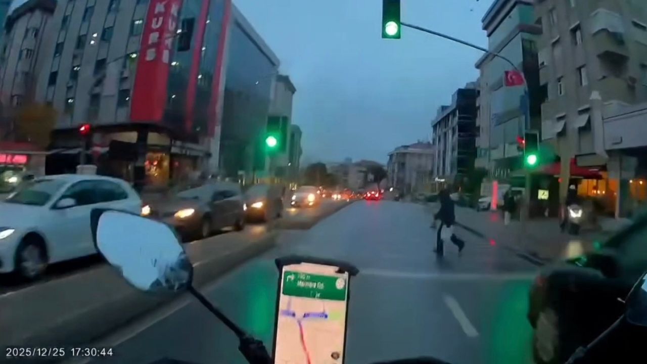 Mert ORDU / İSTANBUL (DHA)- MALTEPE'de yayalara kırmızı ışık yandığı sırada, caddeden karşıya geçmeye çalışan yayaya motosiklet çarptı. Kazada yaya yaralanırken, kaza anı motosiklet sürücüsünün kask kamerasına yansıdı.