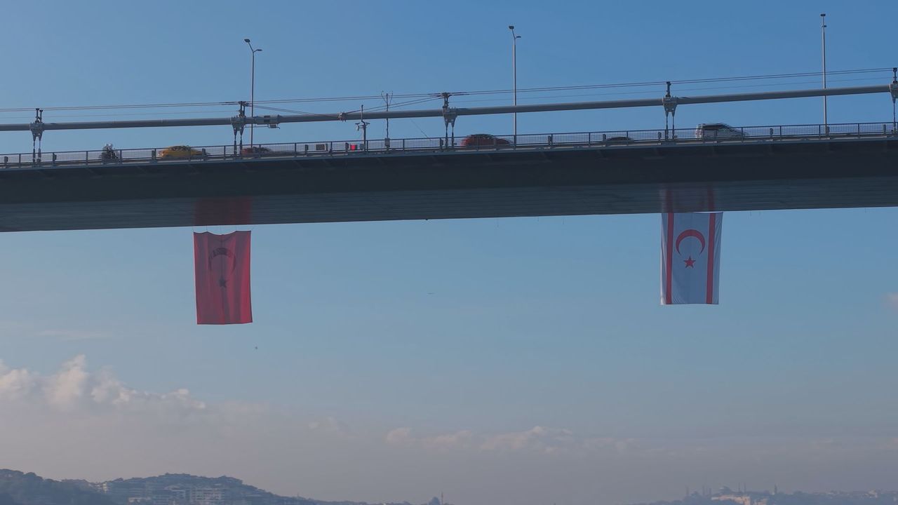 İstanbul'un sembollerinden olan 15 Temmuz Şehitler Köprüsü'nde 15 Kasım 1983 tarihinde kurulan Kuzey Kıbrıs Türk Cumhuriyeti'nin 42'nci kuruluş yılı nedeniyle KKTC bayrağı dalgalandırıldı. Köprüye asılan bayrak dronla havadan görüntülendi. (DHA)