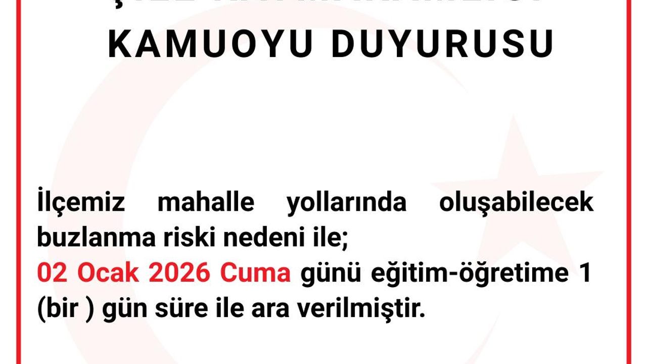 Şile Kaymakamlığı'nın sanal medya hesabından yapılan açıklamada, 'İlçemiz mahalle yollarında oluşabilecek buzlanma riski nedeniyle 2 Ocak 2026 Cuma günü eğitim-öğretime 1 gün süre ile ara verilmiştir' ifadeleri kullanıldı. (DHA)