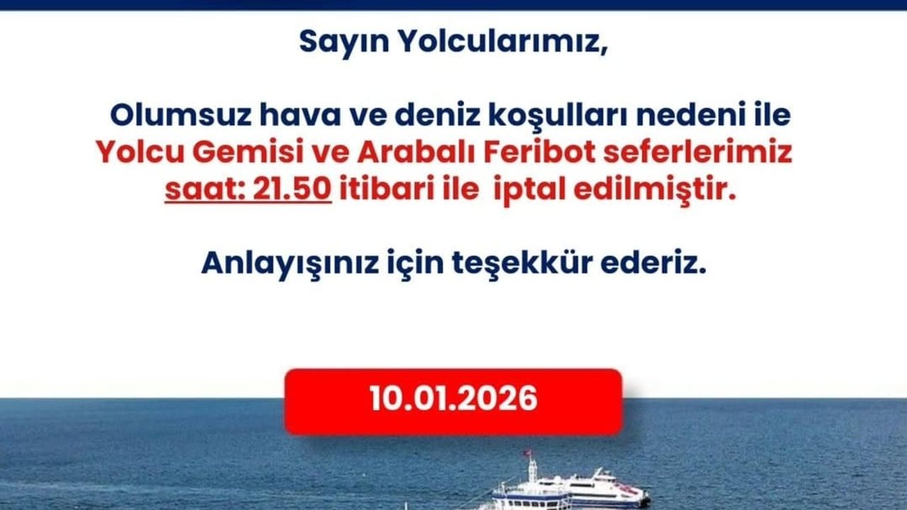 Ege Denizinde etkili olan rüzgar ve olumsuz deniz koşulları nedeniyle İzmir Deniz İşletmeciliği (İzdeniz), yolcu gemisi ve arabalı feribot seferlerinin saat 21.50 itibarıyla iptal edildiğini duyurdu. Yapılan açıklamada, 'Sayın yolcularımız, olumsuz hava ve deniz koşulları nedeni ile yolcu gemisi ve arabalı feribot seferlerimiz saat 21.50 itibari ile iptal edilmiştir' denildi.(DHA)