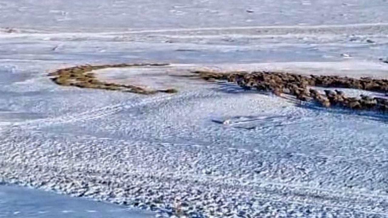 Bedir ALTUNOK/KARS, (DHA)- KARS'ın Ermenistan sınırındaki Yılanlı köyünde yaşayan Süleyman Aydın (18) traktörüyle kar üzerinde ay yıldız yaptı. Ay yıldızın belirgin görünmesi için içini otla dolduran Aydın, ahırdan çıkardığı koyunların otları yemeye başlamasıyla beyaz örtü üzerindeki figür tamamen ortaya çıktı.