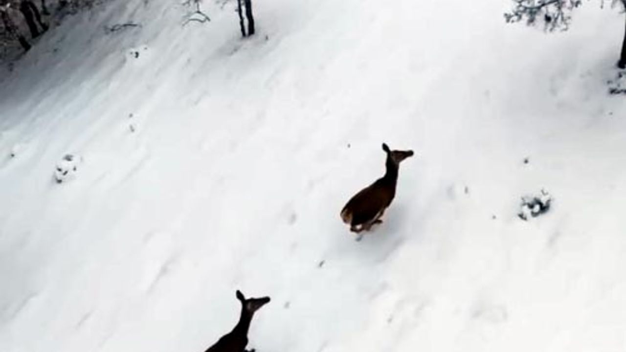 Mutlu YUCA/BOLU, (DHA)- BOLU'nun Seben ilçesinde karla kaplı ormanda gezen 2 karaca dron ile görüntülendi.