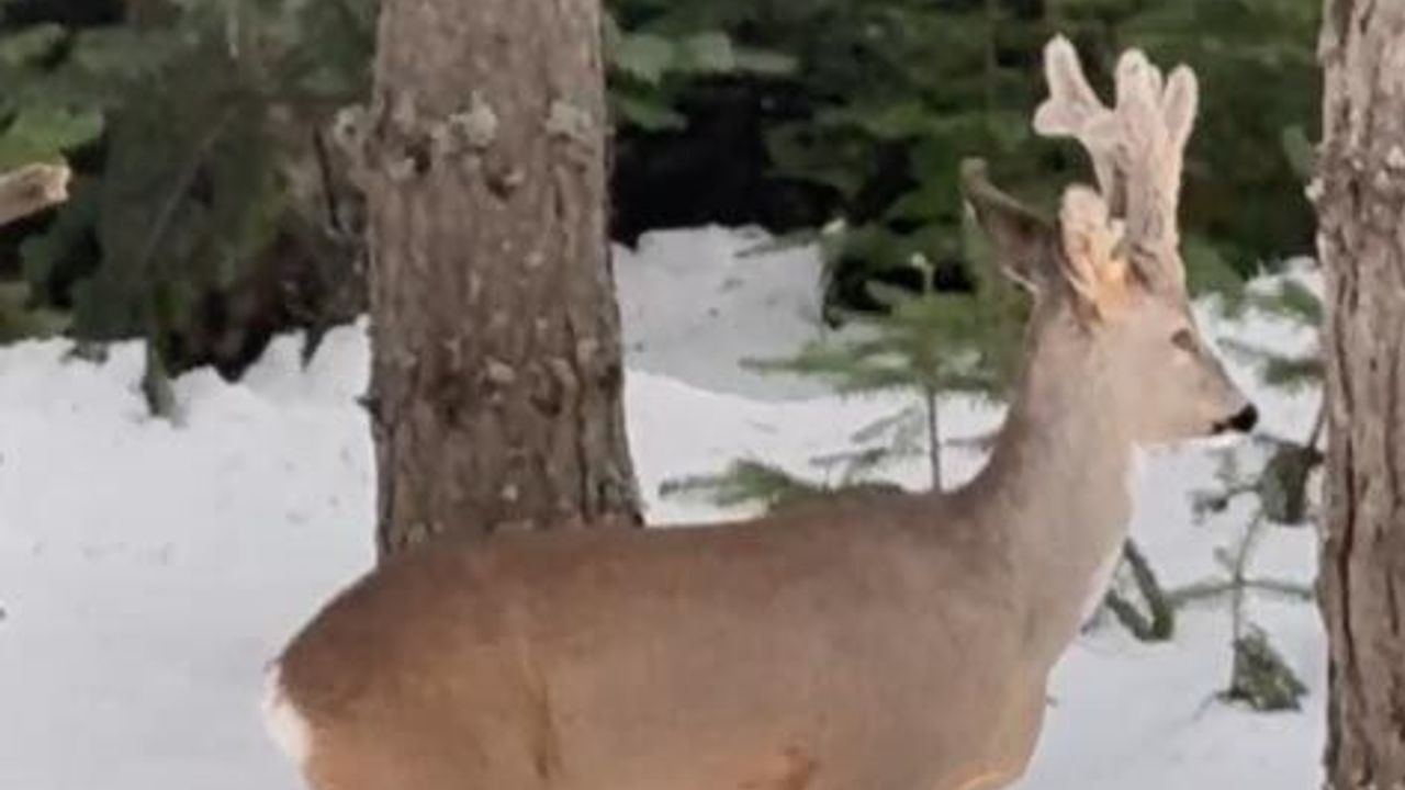 Gerede ilçesinin yüksek kesimlerindeki karla kaplı ormanda karaca görüntülendi. Ormanda gezen karacayı fark eden kişi, o anları cep telefonu ile kaydetti. Bir süre kendisini görüntüleyen kişiye bakan karaca daha sonra ormanın iç kısımlarına girerek gözden kayboldu. (DHA)