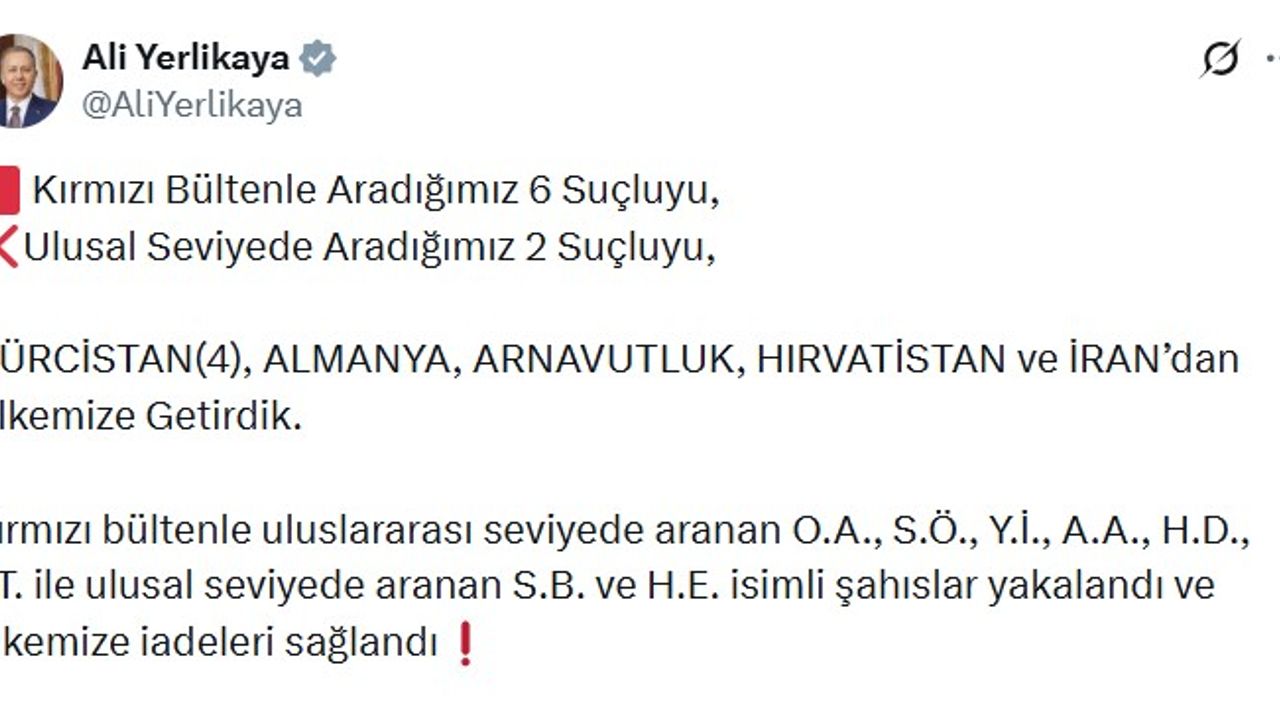 Umutcan ÖREN/ANKARA, (DHA)- İÇİŞLERİ Bakanı Ali Yerlikaya, kırmızı bültenle aranan 6 suçlu ile ulusal seviyede aranan 2 suçlunun Gürcistan, Almanya, Arnavutluk, Hırvatistan ve İran'da yakalanarak Türkiye'ye iadelerinin sağlandığını açıkladı.