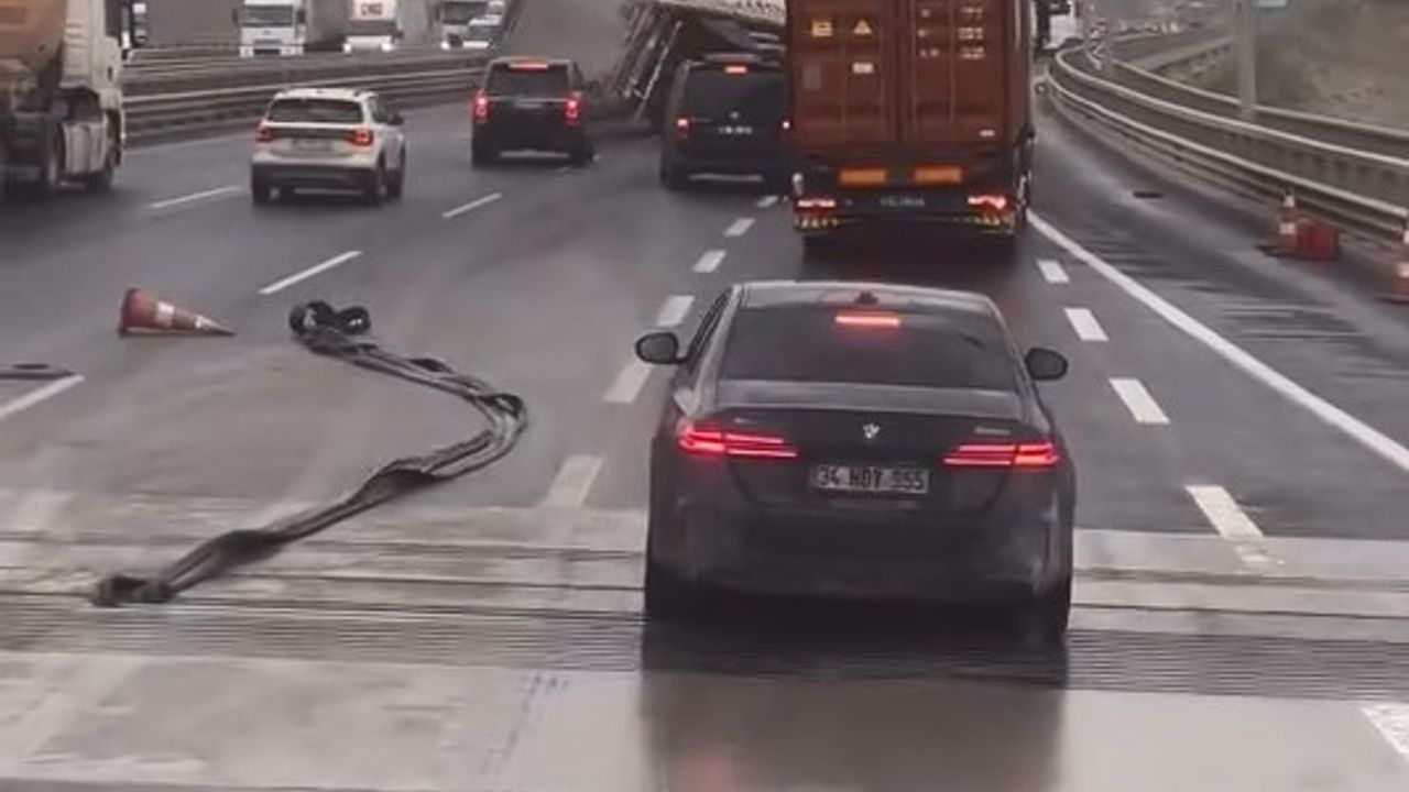 Öte yandan, TIR'lardan birinin devrildiği anın cep telefonu kamerasına yansıyan görüntüsü ortaya çıktı. Görüntüde, rüzgarın etkisiyle dorsenin yalpaladığı ve ardından TIR'ın devrildiği anlar yer aldı. (DHA)