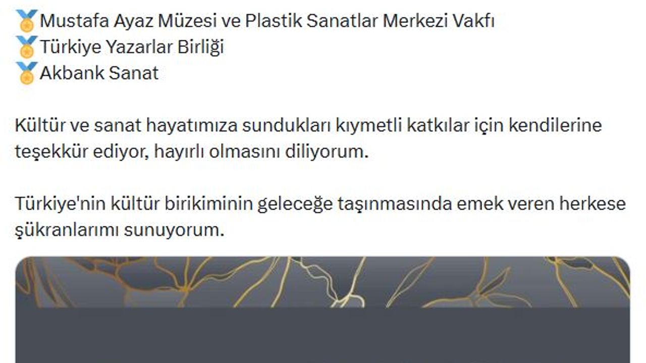 Kültür ve Turizm Bakanı Mehmet Nuri Ersoy, ödüle layık görülen kurumları sosyal medya hesabından açıkladı. Türkiye'nin kültür ve sanatını güçlendiren, üretimi ve yaratıcılığı her geçen yıl daha ileriye taşıyan kurumları desteklemekten büyük memnuniyet duyduklarını dile getiren Ersoy, "Kültür ve Turizm Bakanlığımızın 2025 yılı Özel Ödülleri'nin sahipleri belli oldu. Ülkemizin kültür ve sanatını güçlendiren, üretimi ve yaratıcılığı her geçen yıl daha ileriye taşıyan kurumlarımızı desteklemekten büyük bir memnuniyet duyuyoruz. Mustafa Ayaz Müzesi ve Plastik Sanatlar Merkezi Vakfı, Türkiye Yazarlar Birliği, Akbank Sanat; kültür ve sanat hayatımıza sundukları kıymetli katkılar için kendilerine teşekkür ediyor, hayırlı olmasını diliyorum. Türkiye'nin kültür birikiminin geleceğe taşınmasında emek veren herkese şükranlarımı sunuyorum" dedi. (DHA)