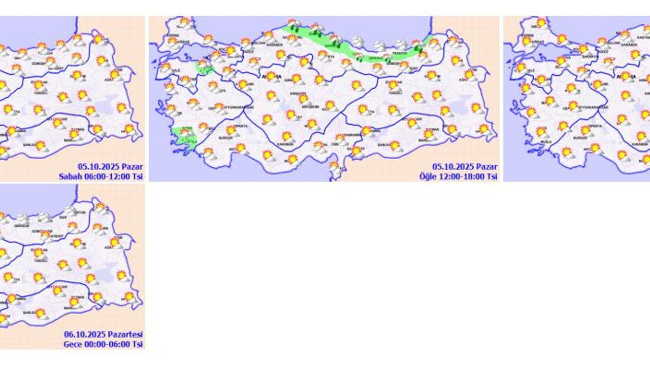 Bölgelerdeki hava durumuna bakıldığında; Marmara Bölgesi'nin parçalı ve çok bulutlu, İstanbul, Sakarya ve Bursa çevrelerinin yerel olmak üzere sağanak yağışlı geçeceği tahmin ediliyor. Ege Bölgesi'nin parçalı ve çok bulutlu, Kıyı Ege'nin sağanak yağışlı geçeceği tahmin ediliyor. Akdeniz ve İç Anadolu Bölgelerinin parçalı ve az bulutlu geçeceği tahmin ediliyor. Batı Karadeniz Bölgesi'nin parçalı ve çok bulutlu, Bartın, Zonguldak ve Sinop çevreleri ile Kastamonu'nun kıyı kesimlerinin sağanak yağışlı geçeceği tahmin ediliyor. Orta ve Doğu Karadeniz Bölgelerinin parçalı ve çok bulutlu, Samsun ve Rize çevreleri, Ordu'nun, Giresun'un ve Trabzon'un iç kesimleri ile Artvin'in kıyı kesimlerinin sağanak yağışlı geçeceği tahmin ediliyor. Doğu Anadolu ve Güneydoğu Anadolu bölgelerinin az bulutlu ve açık geçeceği tahmin ediliyor. (DHA)