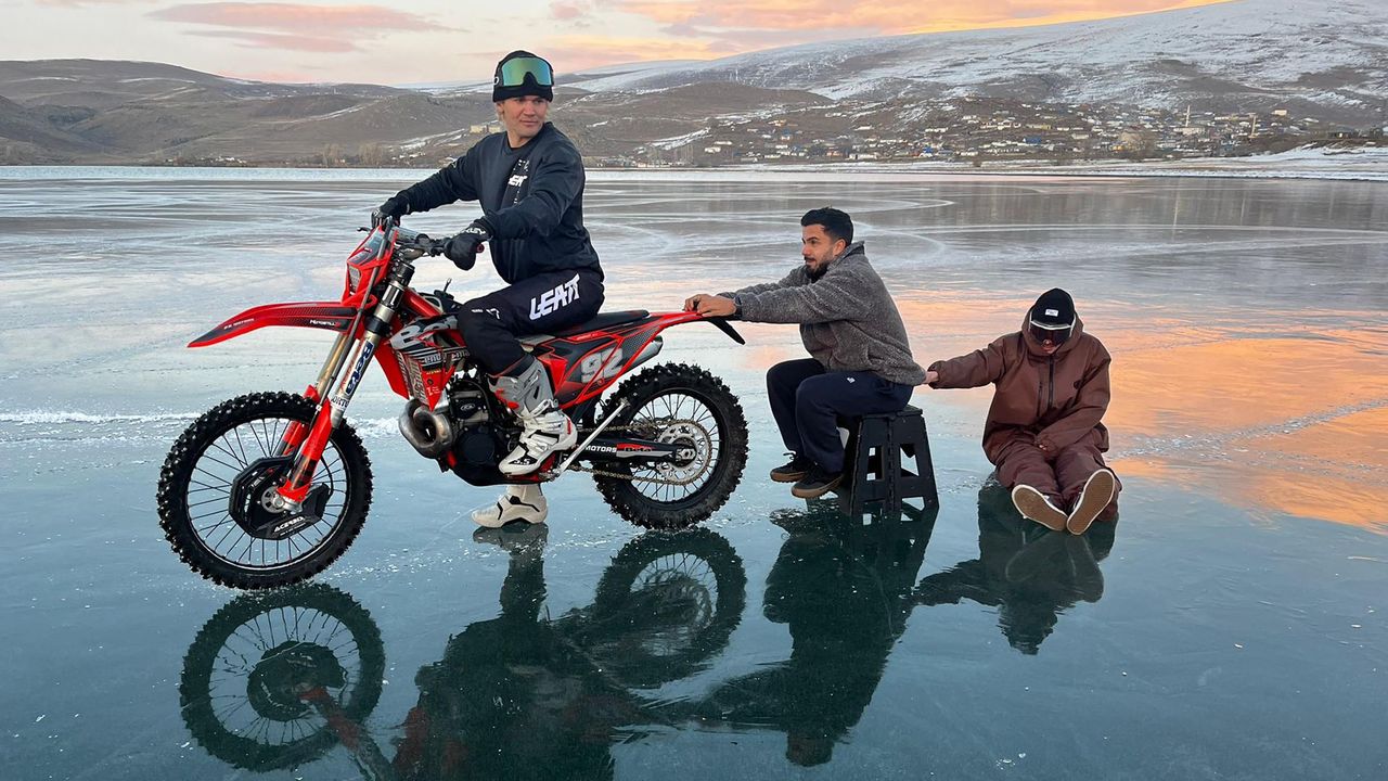 Süleyman Atlı, 'Çivili lastiklerle buz üzerinde sürüş yaptık. Ön lastikte 700, arka lastikte 300 olmak üzere toplam bin çivi var. Bu proje için özel olarak hazırlandık. Çıldır Gölü'nü gerçekten çok seviyorum. Burada yapmayı planladığım daha birçok proje var' dedi.
