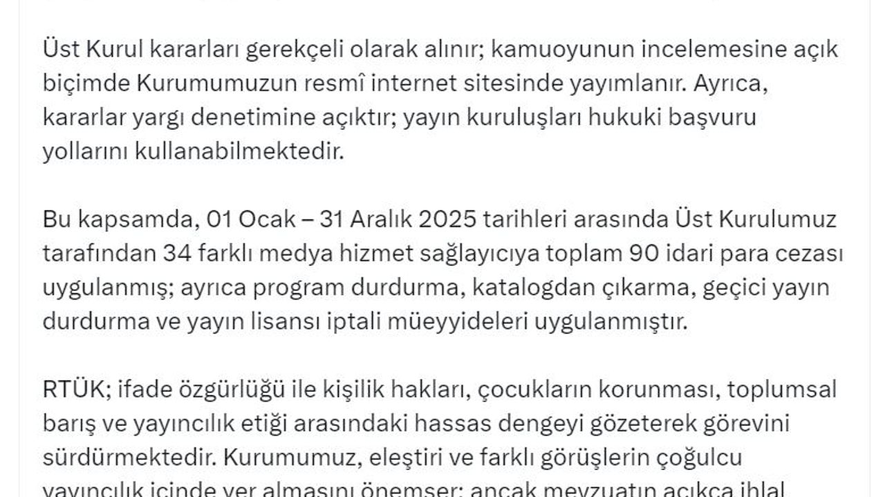 RTÜK Başkanı Daniş, sanal medya hesabından yaptığı açıklamada, 'RTÜK'ün denetim ve yaptırım süreçleri; 6112 sayılı Kanun ve ilgili mevzuat çerçevesinde, yayın içeriklerinin somut ihlalleri esas alınarak yürütülür. Üst Kurul kararları gerekçeli olarak alınır; kamuoyunun incelemesine açık biçimde Kurumumuzun resmi internet sitesinde yayımlanır. Ayrıca, kararlar yargı denetimine açıktır; yayın kuruluşları hukuki başvuru yollarını kullanabilmektedir. Bu kapsamda, 01 Ocak - 31 Aralık 2025 tarihleri arasında Üst Kurulumuz tarafından 34 farklı medya hizmet sağlayıcıya toplam 90 idari para cezası uygulanmış; ayrıca program durdurma, katalogdan çıkarma, geçici yayın durdurma ve yayın lisansı iptali müeyyideleri uygulanmıştır' ifadelerini kullandı.