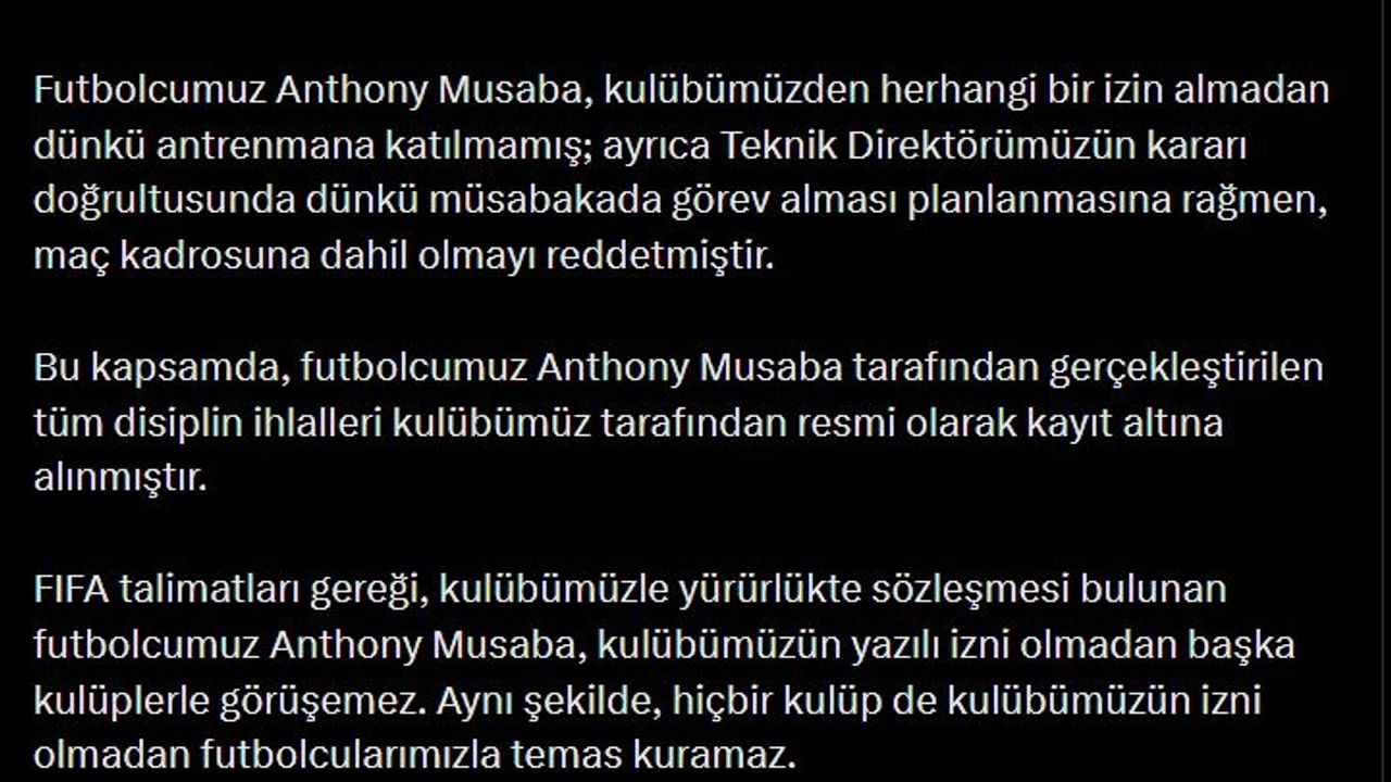 'Futbolcumuz Anthony Musaba, görsel ve sosyal medyada yer alan transfer haberlerinin ardından kulübümüzle olan ilişkisini fiilen kesmiştir. Futbolcumuz Anthony Musaba, kulübümüzden herhangi bir izin almadan dünkü antrenmana katılmamış; ayrıca Teknik Direktörümüzün kararı doğrultusunda dünkü müsabakada görev alması planlanmasına rağmen, maç kadrosuna dahil olmayı reddetmiştir. Bu kapsamda, futbolcumuz Anthony Musaba tarafından gerçekleştirilen tüm disiplin ihlalleri kulübümüz tarafından resmi olarak kayıt altına alınmıştır. FIFA talimatları gereği, kulübümüzle yürürlükte sözleşmesi bulunan futbolcumuz Anthony Musaba, kulübümüzün yazılı izni olmadan başka kulüplerle görüşemez. Aynı şekilde, hiçbir kulüp de kulübümüzün izni olmadan futbolcularımızla temas kuramaz. Mevcut sözleşmesini ve FIFA kurallarını açık şekilde ihlal eden futbolcumuz Anthony Musaba hakkında, kulübümüz tarafından gerekli disiplin süreci başlatılmıştır. Kamuoyunun bilgisine saygıyla sunarız.'
