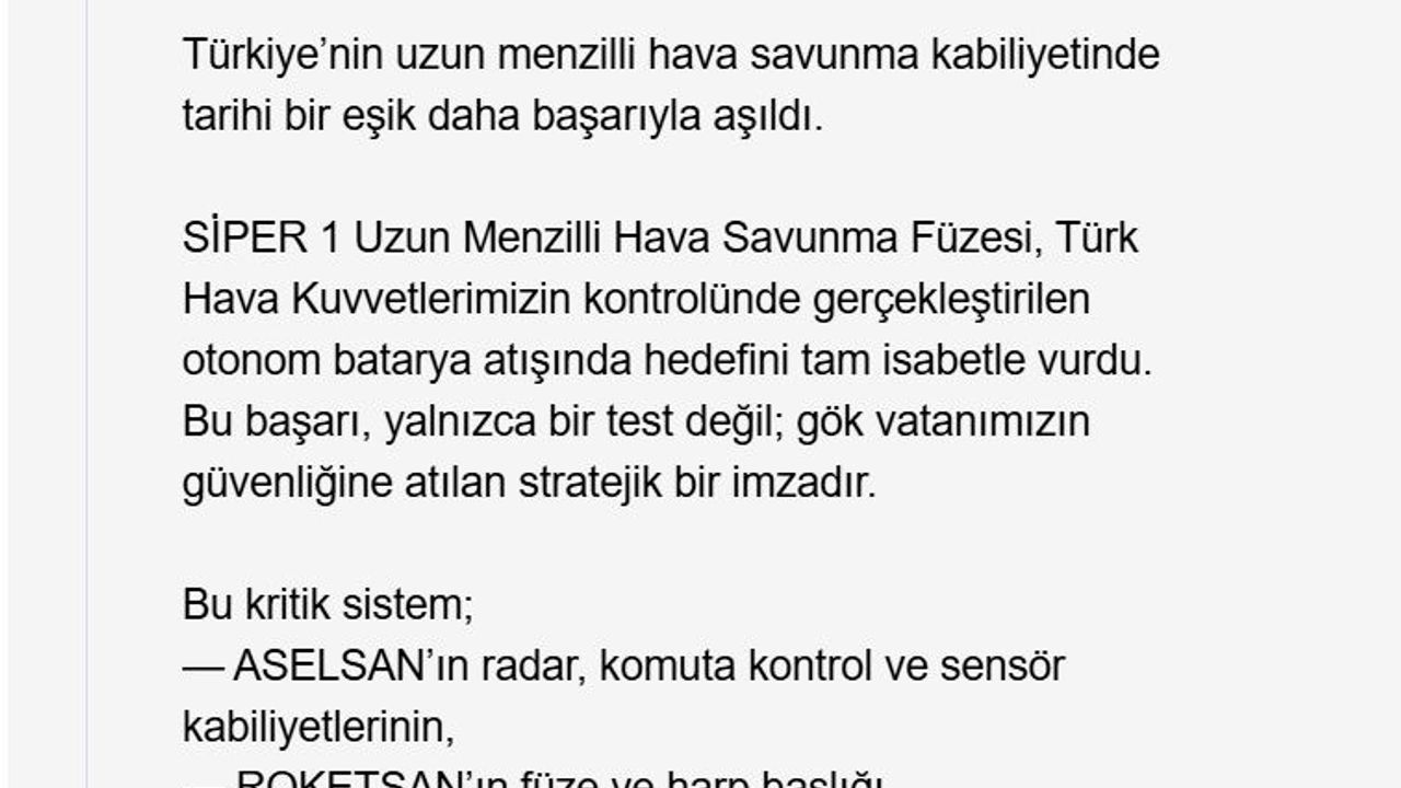 ASELSAN ve ROKETSAN'ın ortaklığında hayata geçirilen SİPER 1 uzun menzilli hava savunma füzesi, Sinop Test Merkezi'nde gerçekleştirilen otonom batarya atışında hedefini tam isabetle vurdu. Savunma Sanayii Başkanı Haluk Görgün, NSosyal hesabından test atışına ilişkin görüntüleri paylaşarak, "Türkiye'nin uzun menzilli hava savunma kabiliyetinde tarihi bir eşik daha başarıyla aşıldı. SİPER 1 uzun menzilli hava savunma füzesi, Türk Hava Kuvvetlerimizin kontrolünde gerçekleştirilen otonom batarya atışında hedefini tam isabetle vurdu. Bu başarı, yalnızca bir test değil; gök vatanımızın güvenliğine atılan stratejik bir imzadır. Bu kritik sistem; ASELSAN'ın radar, komuta kontrol ve sensör kabiliyetlerinin, ROKETSAN'ın füze ve harp başlığı mühendisliğinin, Hava Kuvvetlerimizin tecrübesi ve operasyonel birikiminin mükemmel bir uyumla birleştiği yerli ve milli bir güç çarpanıdır. Bugün elde edilen sonuç, Türkiye'nin hava savunmasında kendi gök kalkanını inşa etme iradesinin ve mühendislik kudretinin en somut göstergelerinden biridir. SİPER, yalnızca bir savunma sisteminin adı değil; milletimizin ufkunu, iradesini ve bağımsızlığını koruyan çelikten bir sözdür. Bu başarı için; ASELSAN'a, ROKETSAN'a, Türk Hava Kuvvetlerimizin kahraman personeline ve tüm mühendislerimize, teknisyenlerimize gönülden teşekkür ediyorum. Gök vatan emin ellerdedir. Daha ileri, daha güçlü, daha yüksek hedeflere doğru" ifadelerini kullandı. (DHA)