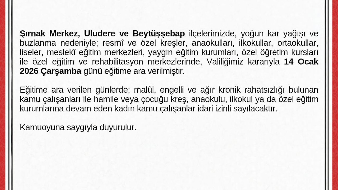 Şırnak Valiliği'nden yapılan açıklamada, yoğun kar yağışı ve buzlanma nedeniyle kent merkezi ile Uludere ve Beytüşşebap ilçelerinde 14 Ocak Çarşamba günü eğitime ara verildiği belirtildi. Açıklamada, 'Şırnak merkez, Uludere ve Beytüşşebap ilçelerimizde, yoğun kar yağışı ve buzlanma nedeniyle; resmi ve özel kreşler, anaokulları, ilkokullar, ortaokullar, liseler, mesleki eğitim merkezleri, yaygın eğitim kurumları, özel öğretim kursları ile özel eğitim ve rehabilitasyon merkezlerinde, Valiliğimiz kararıyla 14 Ocak 2026 Çarşamba günü eğitime ara verilmiştir. Eğitime ara verilen günlerde; malul, engelli ve ağır kronik rahatsızlığı bulunan kamu çalışanları ile hamile veya çocuğu kreş, anaokulu, ilkokul ya da özel eğitim kurumlarına devam eden kadın kamu çalışanları idari izinli sayılacaktır' denildi. (DHA)