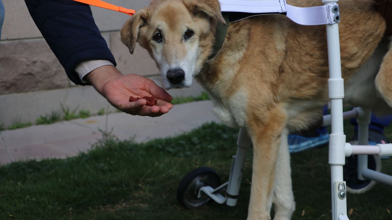 Gizem CENGİL-Emirhan YÜZÜGÜLDÜ/ANKARA, (DHA)- ANKARA'nın Çankaya ilçesinde kansere bağlı olarak felç geçiren sokak köpeği Fıstık, 16 yıldır bahçesinde yaşadığı sitenin görevlisi Şahin Sungur'un (48) yaptığı yürüteç ile yeniden adım atmaya başladı.