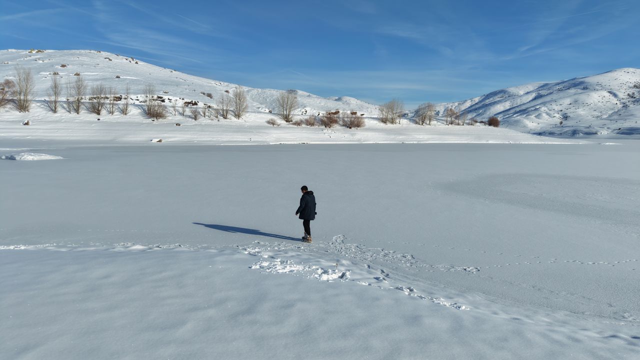 Kentte 2 gün süren yoğun kar yağışının ardından etkili olan soğuk hava hayatı olumsuz etkiliyor. Hava sıcaklığının sıfırın altında 14 dereceye kadar düştüğü Sivas'ta, kent merkezine yaklaşık 50 kilometre uzaklıktaki 2 bin 552 rakımlı Yıldız Dağı'nın güneyindeki Yıldız Göleti'nin yüzeyi buz tuttu. Yıldız Dağı ile özellikle kış mevsiminde doğaseverler ve fotoğraf tutkunlarının uğrak yerleri arasında bulunan gölet, dron ile havadan görüntülendi. (DHA)