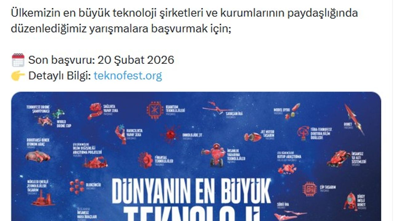 ANKARA, (DHA)- SANAYİ ve Teknoloji Bakanı Mehmet Fatih Kacır, TEKNOFEST 2026 Teknoloji Yarışmaları başvurularının başladığını duyurdu.