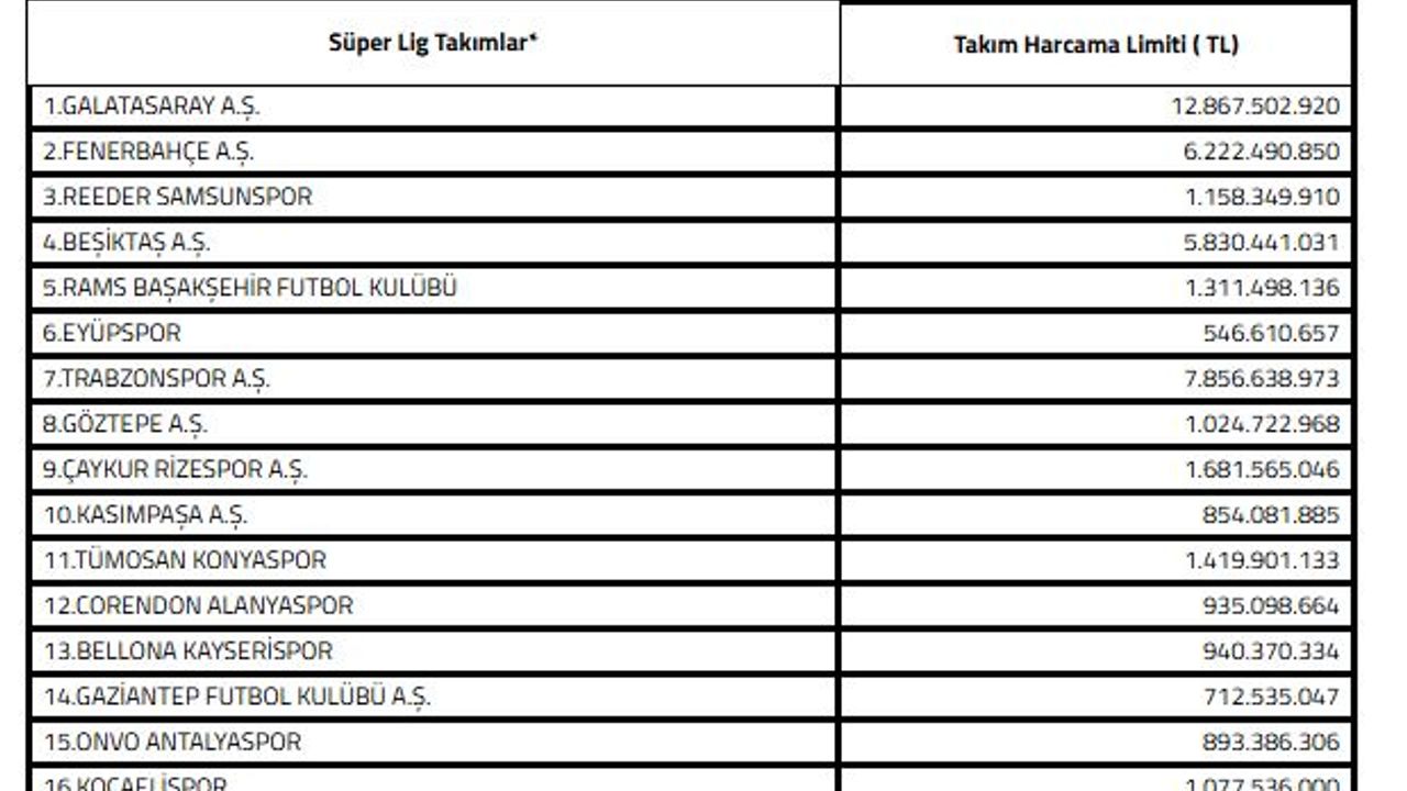 TFF tarafından açıklanan harcama limitleri şöyle: