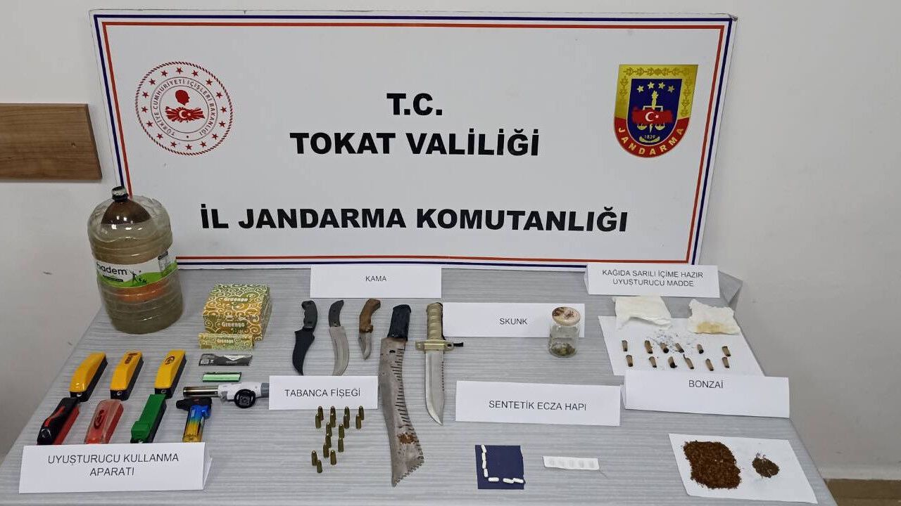 Tokat İl Jandarma Komutanlığı ekipleri, Zile ilçesinde 4 şüphelinin uyuşturucu ticareti yaptığı bilgisi üzerine harekete geçti. Teknik ve fiziki takibin ardından adli makamlardan alınan izinle şüphelilerin ikamet ve iş yerlerine eş zamanlı operasyon düzenlendi. Yapılan aramalarda; 22 gram skunk, 23 adet sentetik ecza hapı, 37 gram tütüne emdirilmiş bonzai, 12 adet kullanıma hazır sarılı skunk, 8 adet uyuşturucu kullanma ve sarma aparatı ile 19 adet tabanca mermisi ve 5 adet bıçak ele geçirildi. Olayla ilgili gözaltına alınan 4 şüpheli hakkında adli işlem başlatıldı. (DHA)
